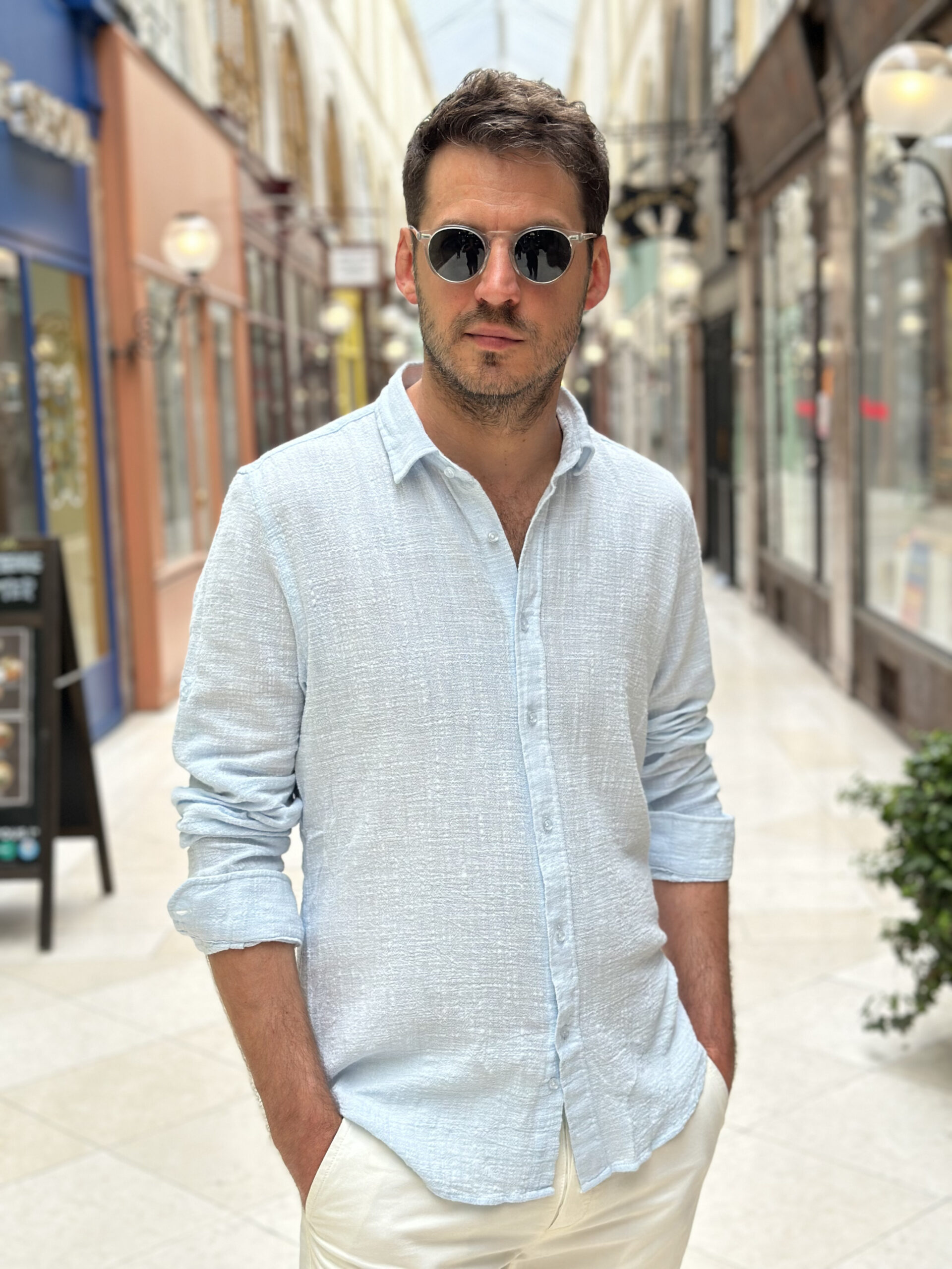 Notre nouvelle chemise Ennio est une pépite… Confectionnée dans un tissu gaufré hyper agréable comme un gaze de coton mais mélangé à du lin, ce qui lui donne un look unique et super stylé pour l’été … Taille regular > pour un porté plus cintré prenez une taille en dessous de la taille habituelle