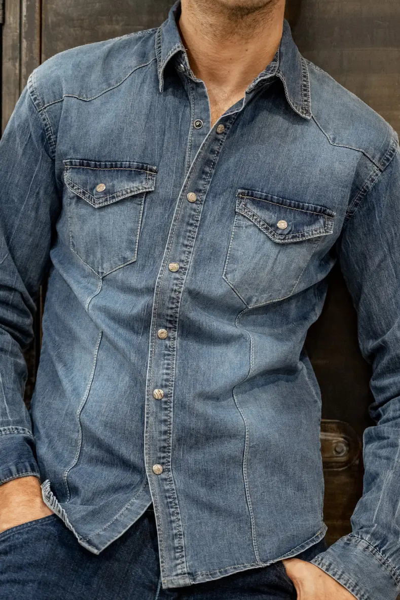 La chemise Western, en tissu jeans léger et délavé est un classique du style américain mais revue avec une coupe plus ajusté, à l’italienne.